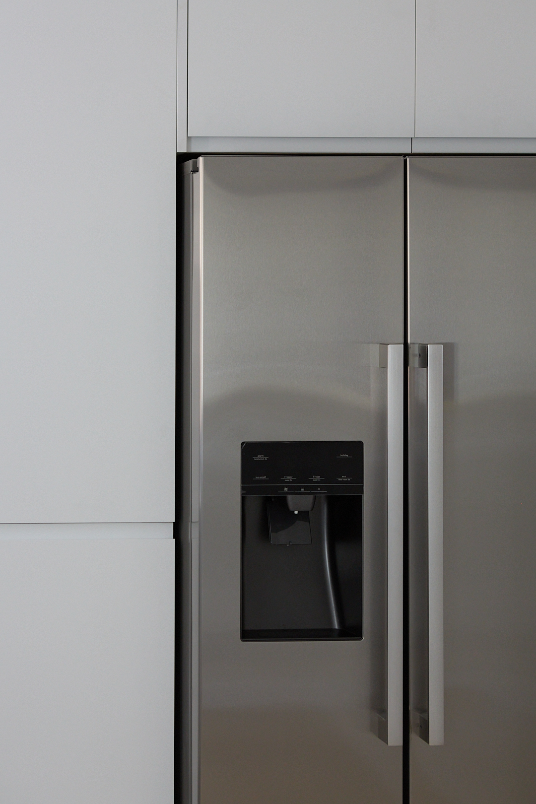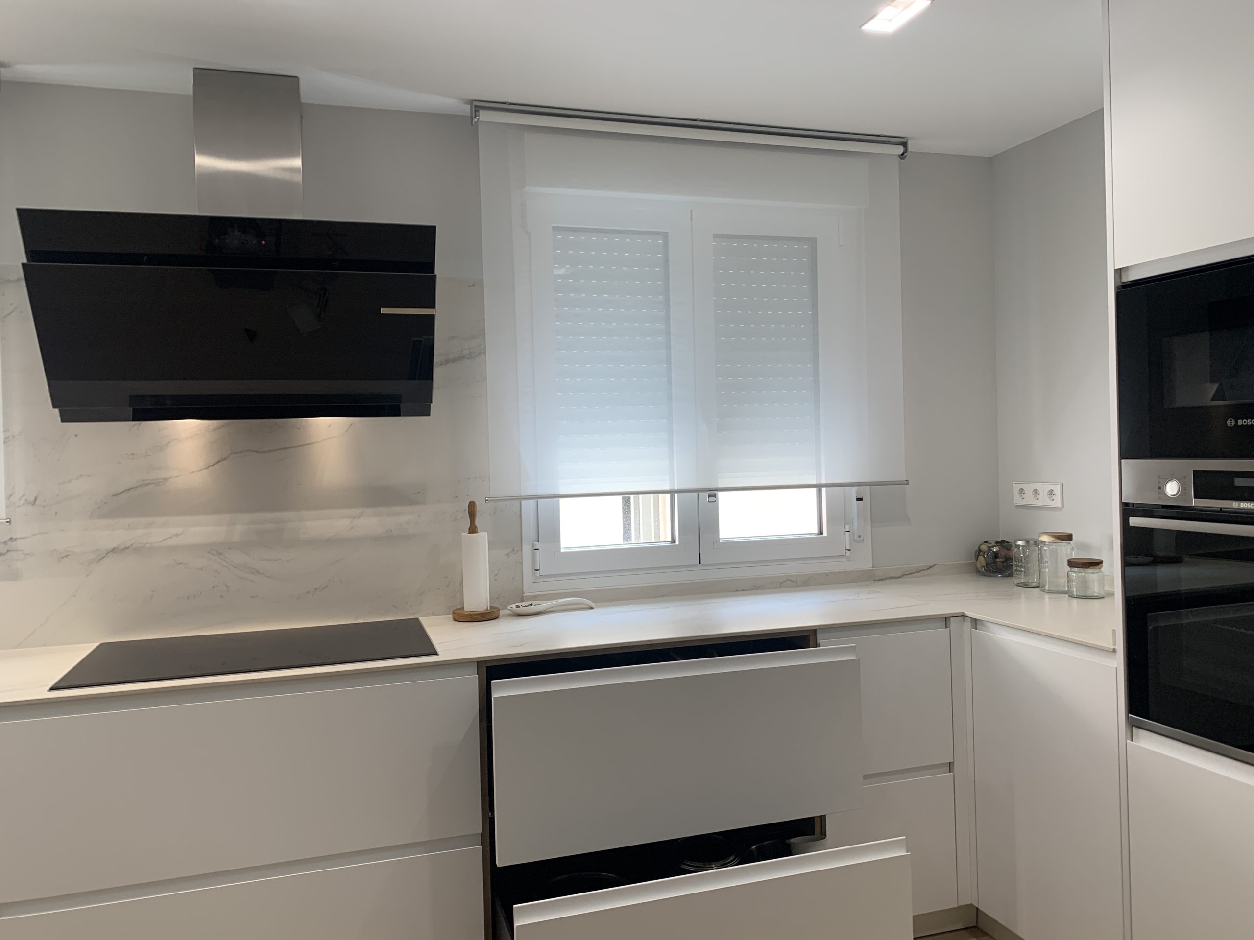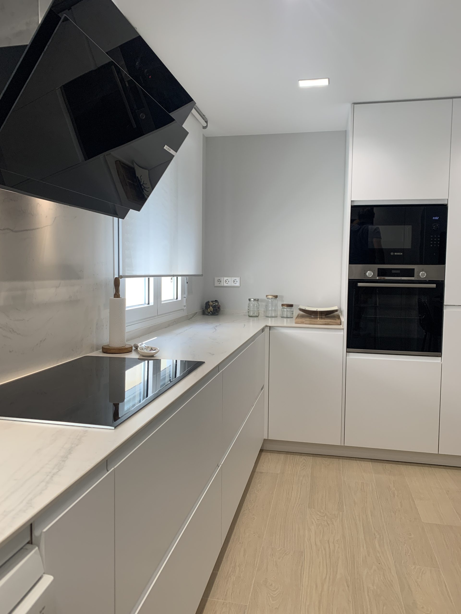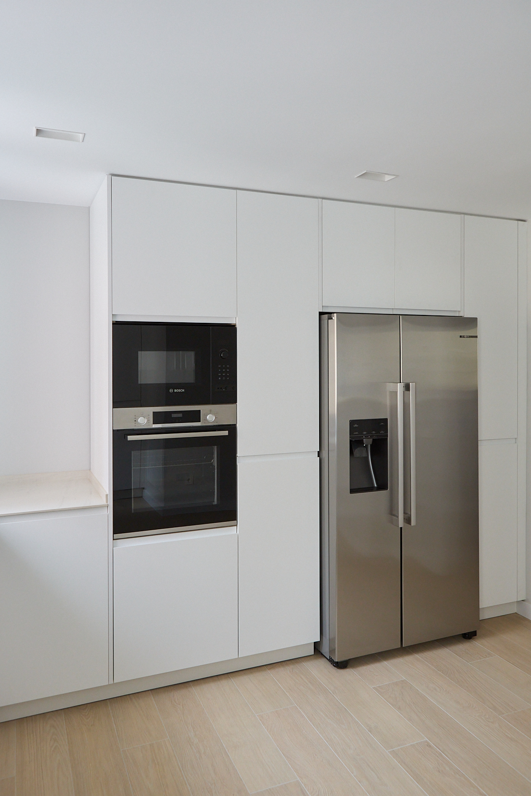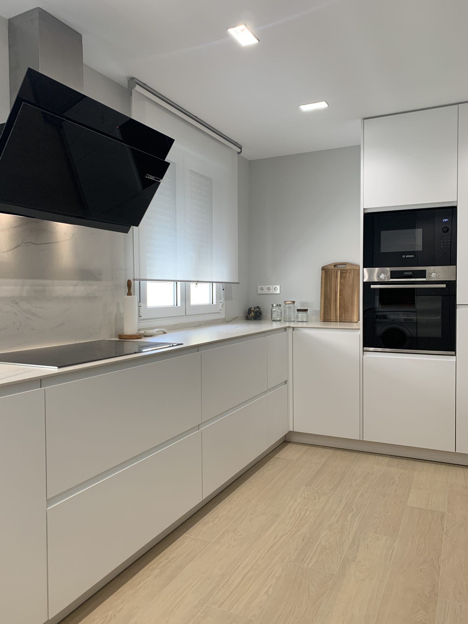 La cocina, corazón del proyecto, crece en superficie y en uso. Se resuelve con una composición en U de frentes blancos lisos, y encimera porcelánica para máxima durabilidad. Se integran frigorífico americano con dispensador, columna de hornos y campana negra de diseño. El resultado: almacenaje generoso, superficie continua y un flujo de trabajo impecable.