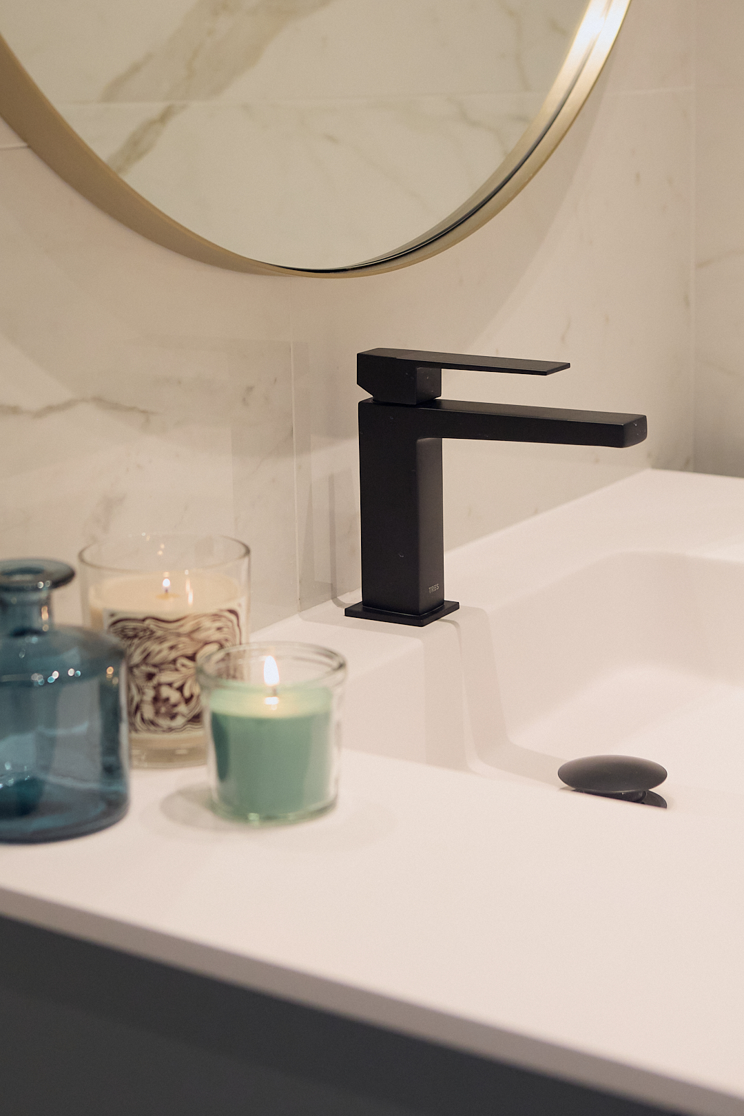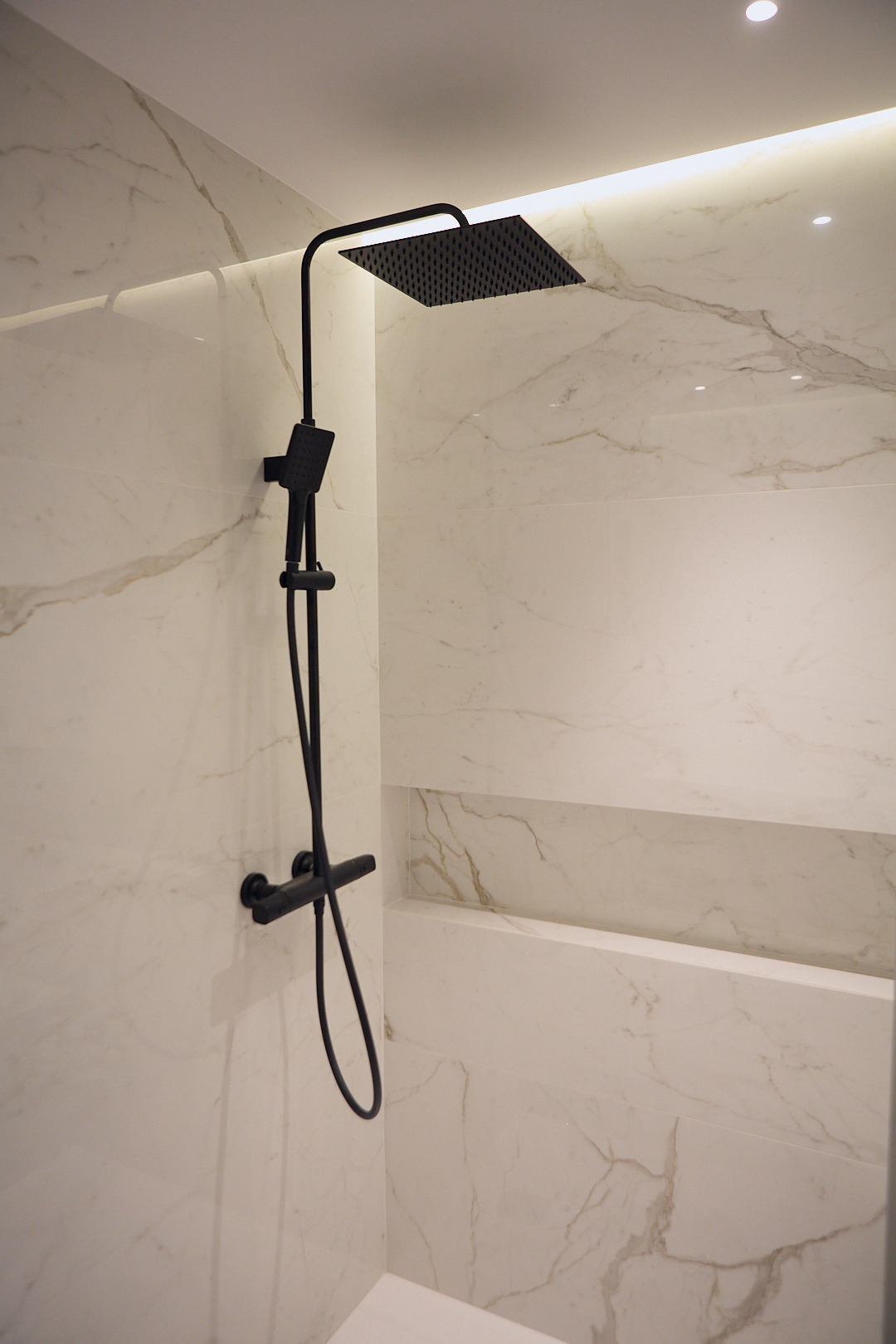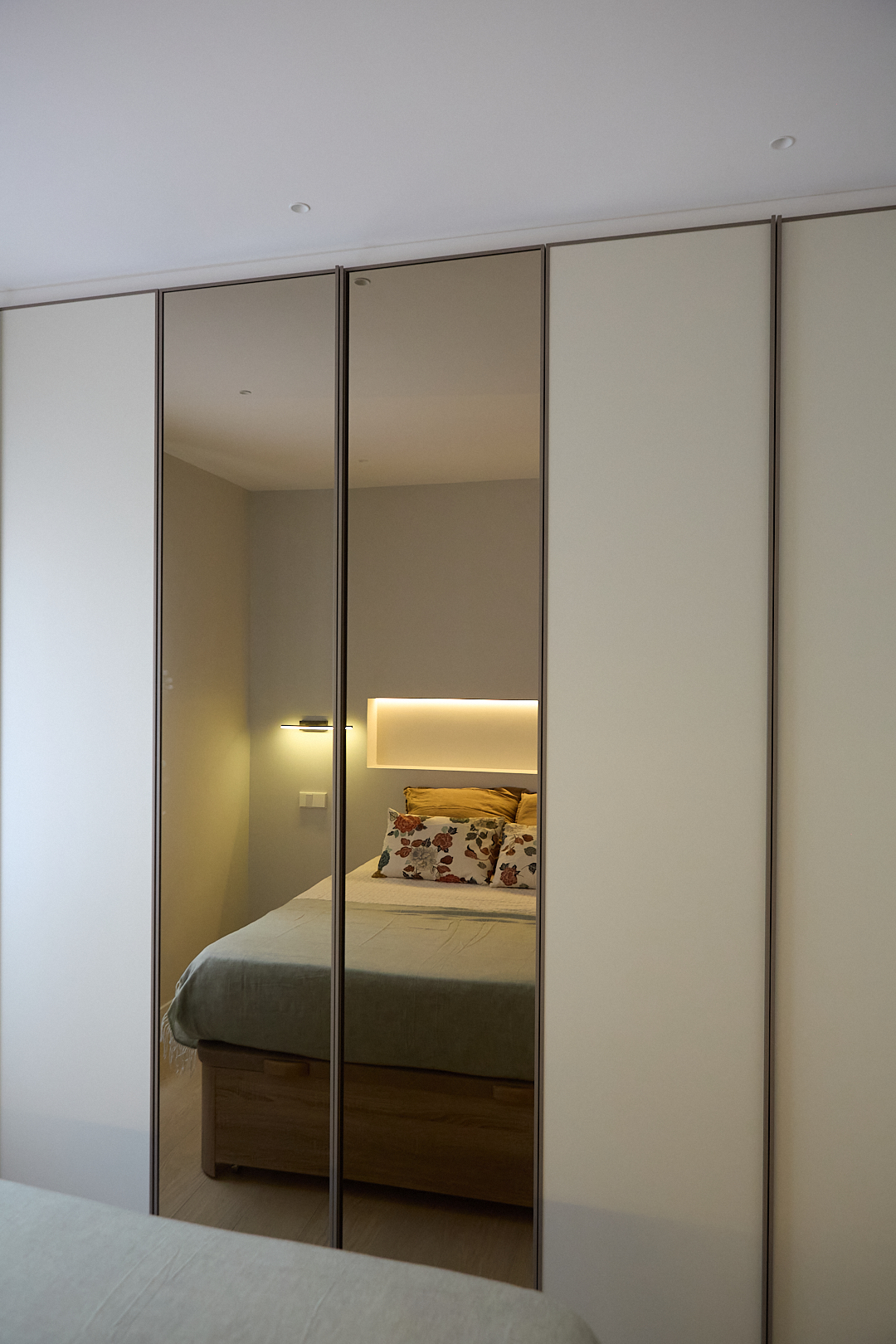 La zona de noche reúne dos dormitorios optimizados. En el principal, cabecero retroiluminado y armarios a medida; en el baño, un único pero completo espacio con revestimientos claros, grifería negra mate, ducha con rociador y detalles cálidos que refuerzan la sensación de spa doméstico.