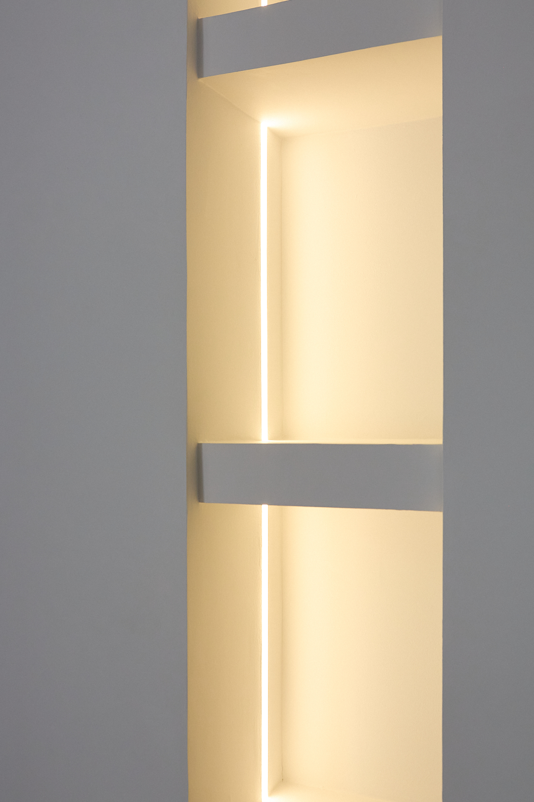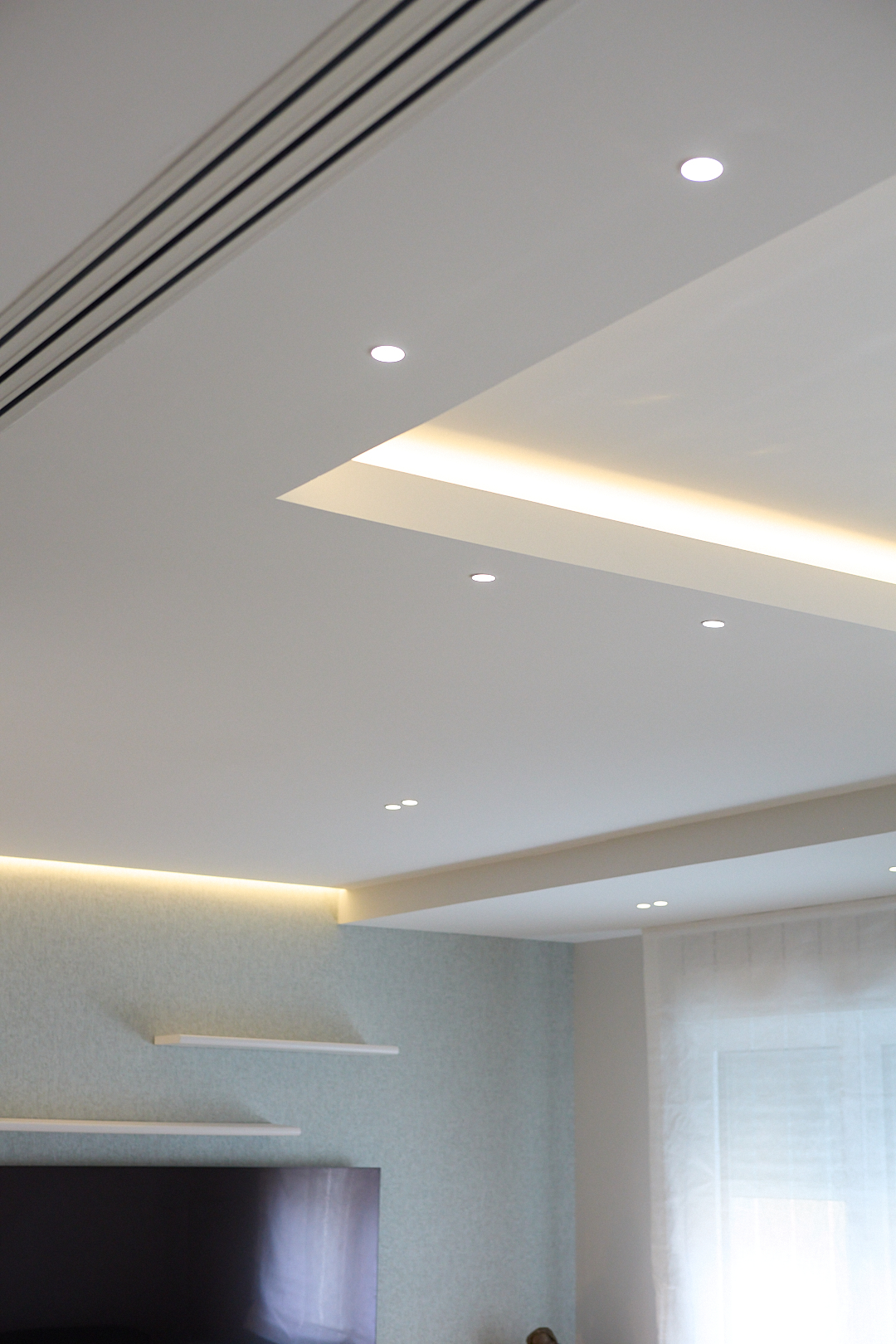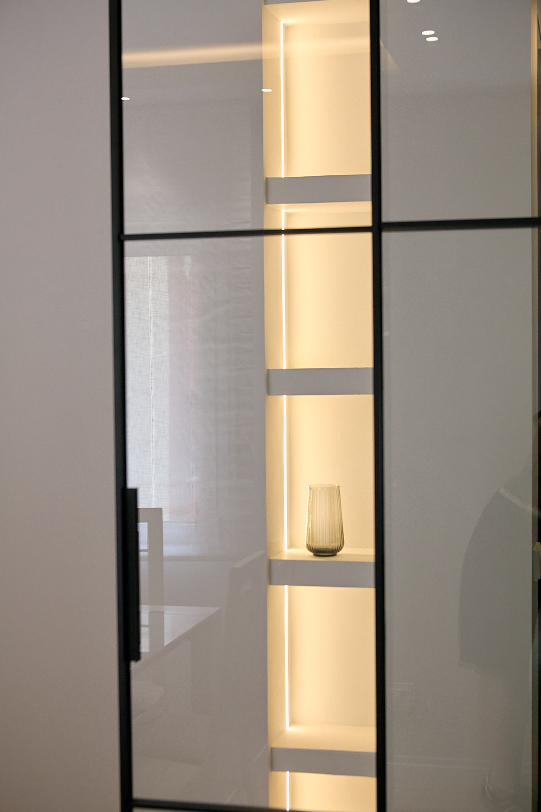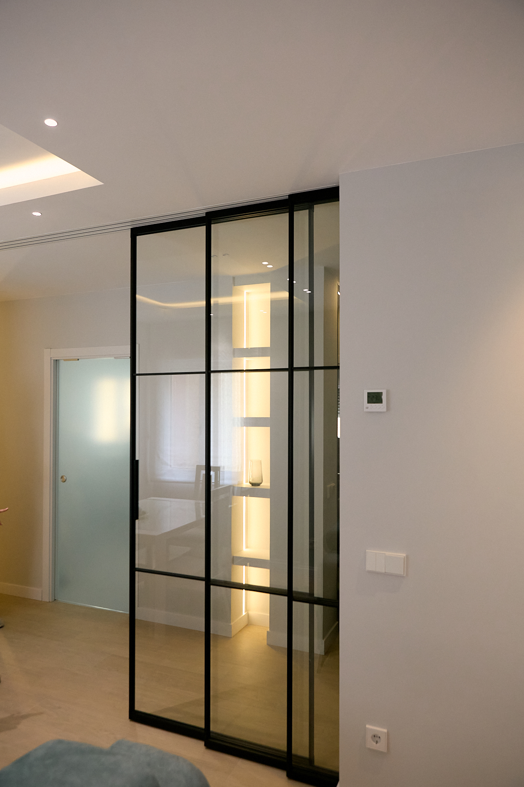 La conexión entre espacios se enfatiza con puertas correderas de vidrio y perfilería negra que filtran vistas y luz. La iluminación es protagonista: foseados y líneas LED en techo y paramentos, luminarias empotradas y luz de acento en el comedor, que permiten crear escenas para la vida diaria y para reuniones.