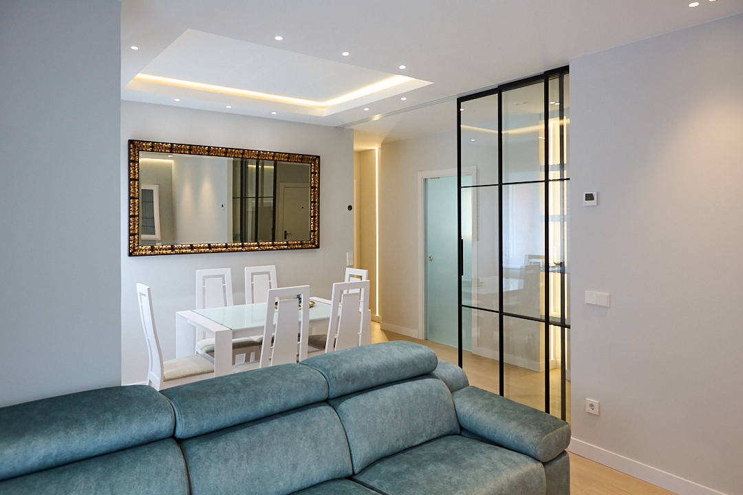Una intervención radical en la distribución que reorganiza la vivienda para la vida actual. La estrategia fue clara: concentrar los núcleos de paso y liberar el espacio diurno para crear un gran ambiente social donde conviven cocina protagonista y comedor ampliado para albergar más comensales puntuales.