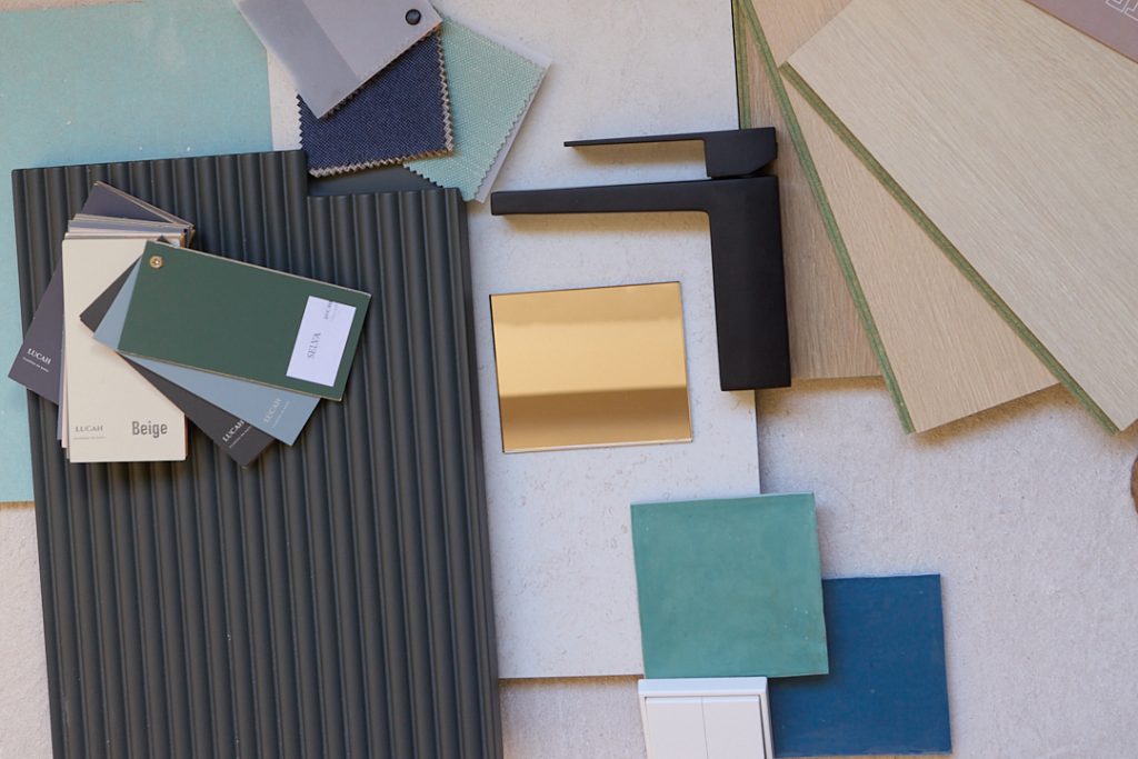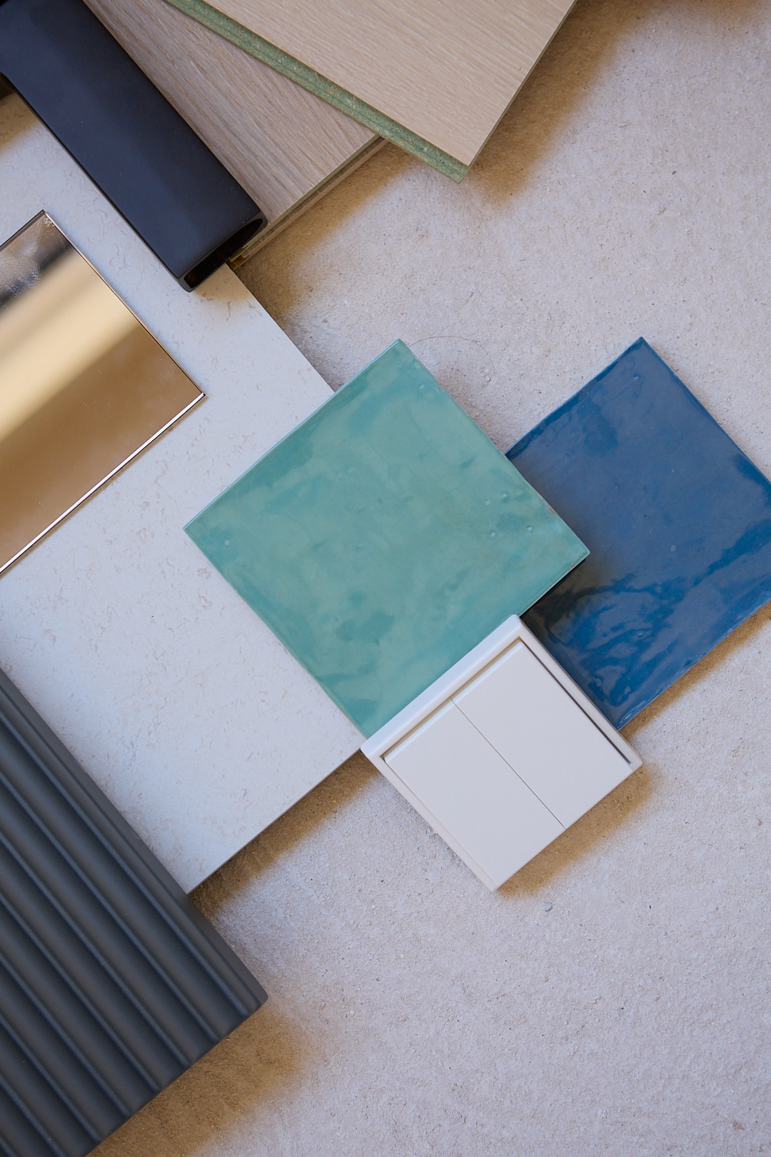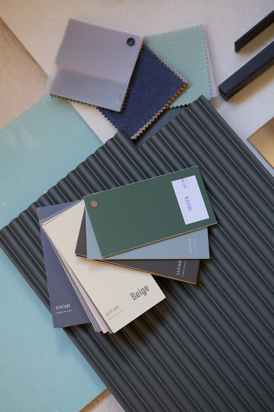 La paleta combina blancos luminosos, neutros cálidos, notas grafito/negro en perfilerías y griferías, y toques metalizados que aportan brillo. Las tablas de materiales del proyecto recogen piedra clara, lacados blancos, acero y textiles suaves para un conjunto sereno y atemporal.