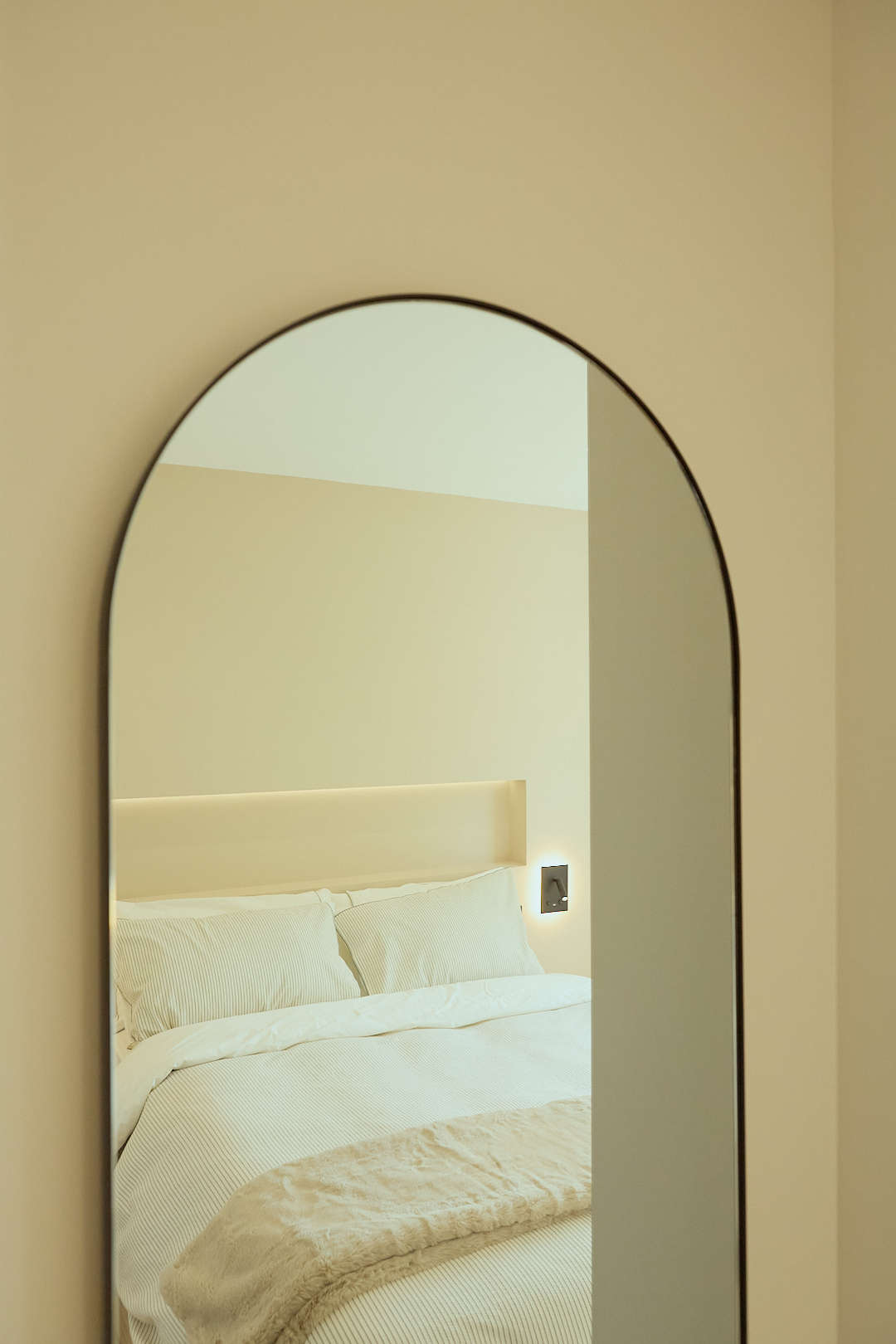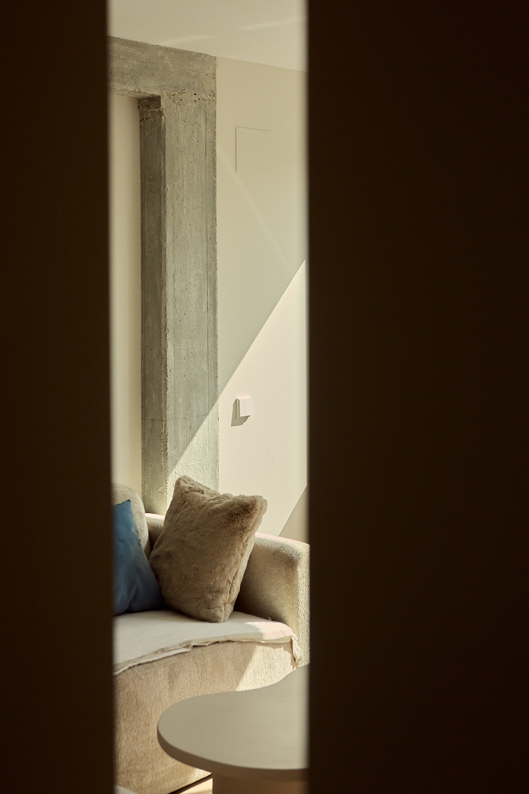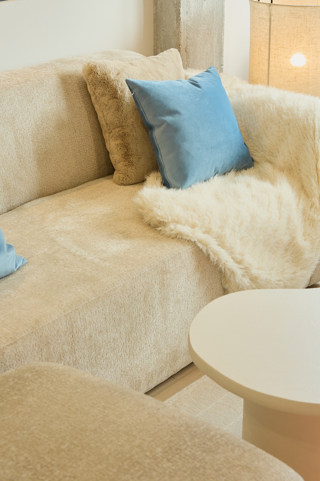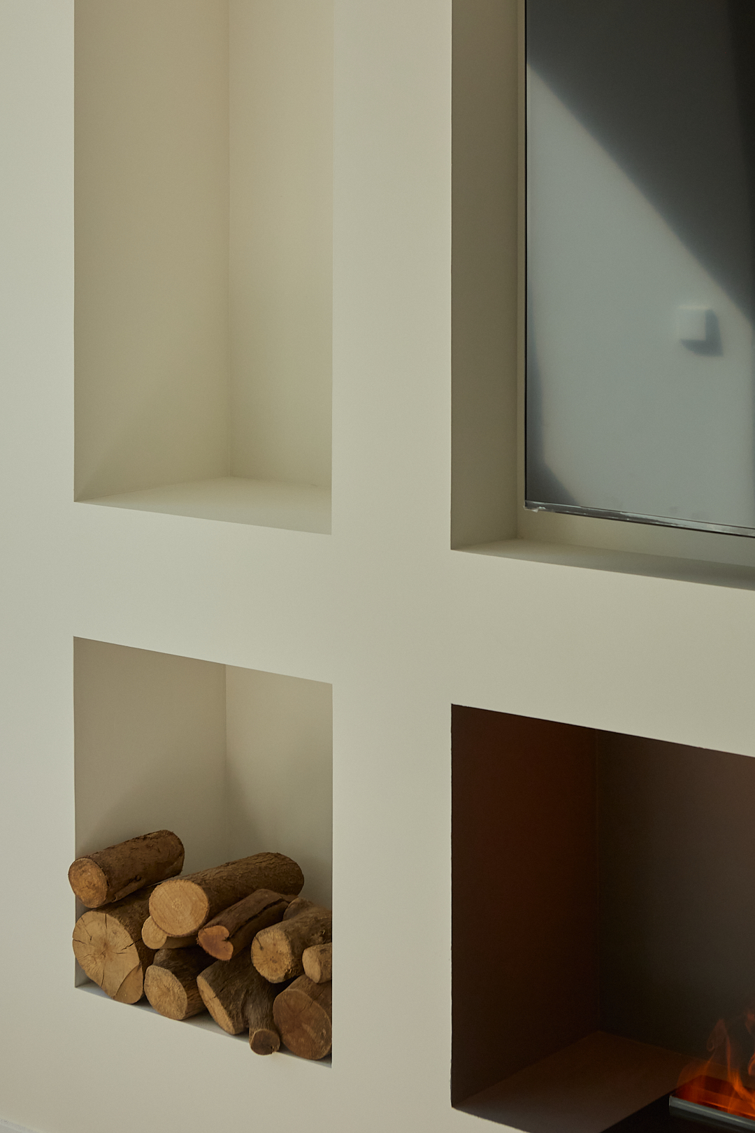Para aportar calidez, se han incorporado textiles suaves en tonos neutros y terrosos en el salón y dormitorio, generando un ambiente acogedor y equilibrado. La presencia de una chimenea de vapor en el área social aporta un toque de confort y modernidad, sin la necesidad de una instalación compleja. Este elemento no solo brinda un ambiente cálido visualmente, sino que también se convierte en un punto focal que complementa el diseño moderno del apartamento.