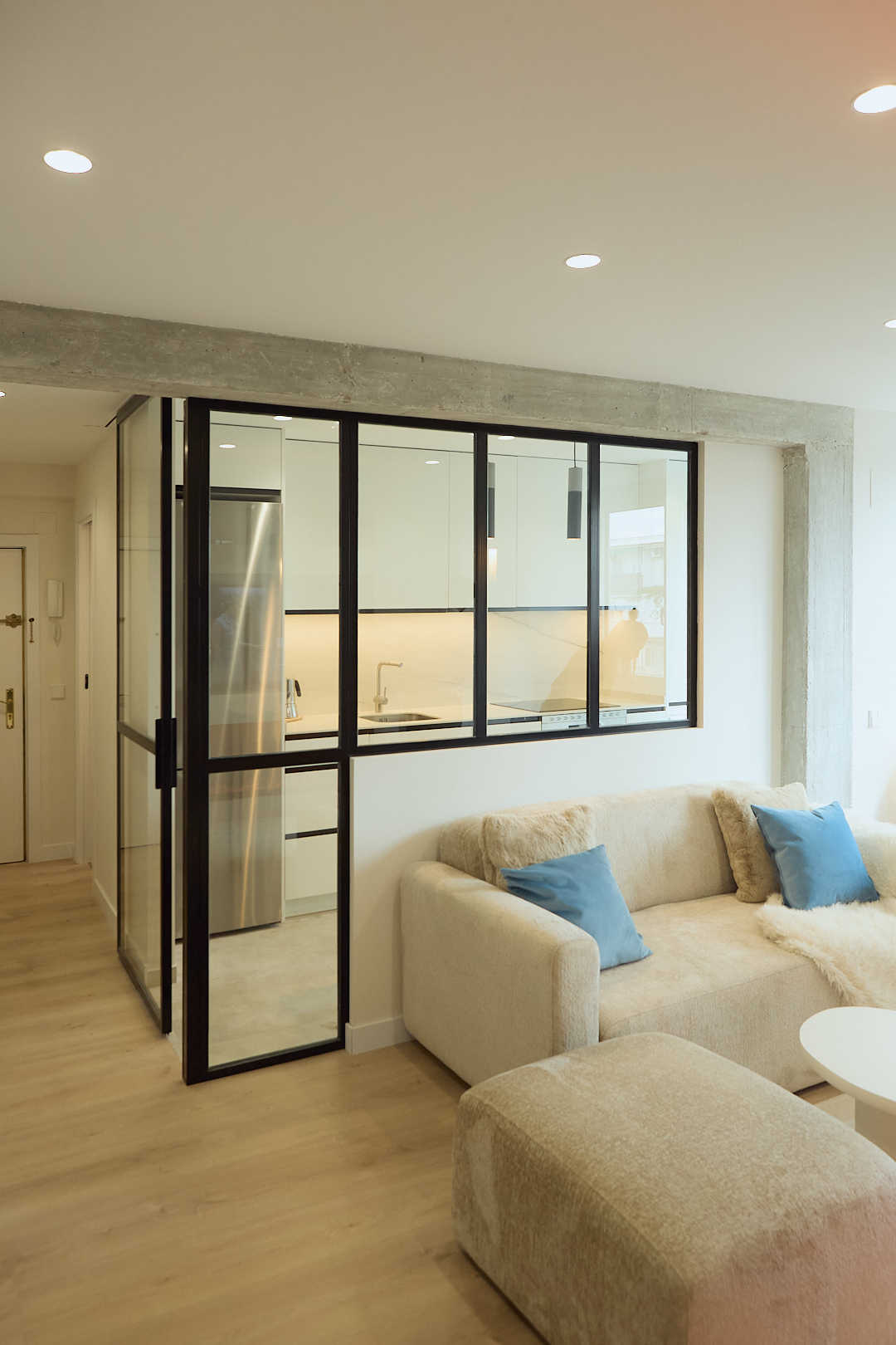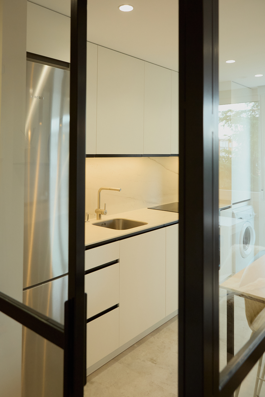 Este proyecto transforma un apartamento en un espacio elegante y contemporáneo, integrando funcionalidad y estética. En el corazón del hogar, la cocina destaca con su diseño abierto, donde un cerramiento de vidrio y aluminio negro separa sutilmente las áreas sin bloquear la luz natural. La cocina, totalmente blanca, crea una atmósfera luminosa y espaciosa, mientras que los detalles en negro –en tiradores, grifería y molduras del cerramiento– añaden un toque sofisticado y contrastante.